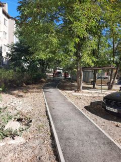 Двор не проездной, можно оставлять машину, сделали дороги вокруг дома, площадку детскую обновили и еще одну сделали, вечером освещение как днем.