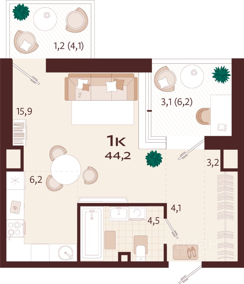 Продаётся 1-комнатная квартира в строящемся доме (Корпус 3), срок сдачи: II-кв. 2027, общей площадью 44.2 кв.м., на 9 этаже. Жилой комплекс бизнес-класса "РОЯЛТА" от застройщика "ГК ТОЧНО" в городе Ялта Республики Крым на улице Спендиарова.