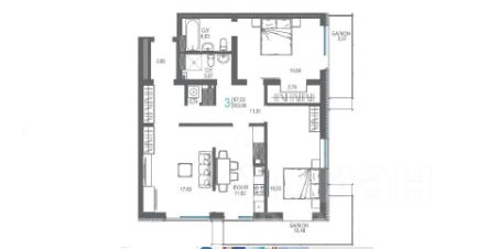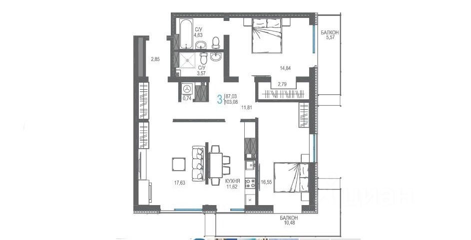 • две спальни (одна — мастер спальня с собственным санузлом),