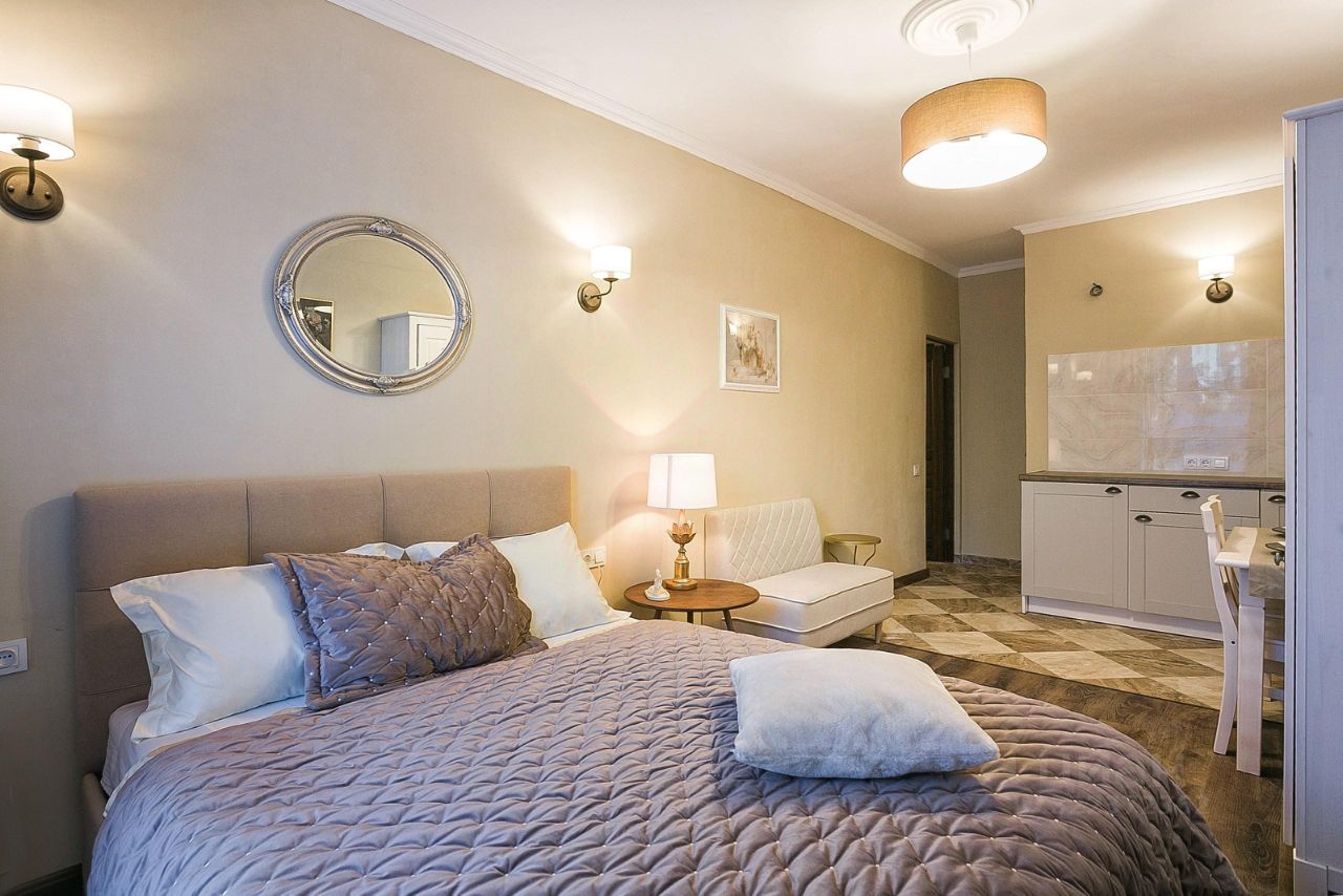 Однако это лишь один из сценариев. Благодаря продуманной концепции и легко трансформируемой мебели и технике, квартира легко превращается в две отдельные студии. Каждая из них обладает собственным санузлом и грамотно спланированным пространством, идеально подходящим для сдачи в аренду или приема гостей.