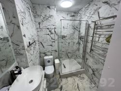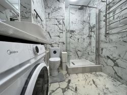 — Совмещенный санузел с душевой кабиной. Шкаф для бытовой химии, стиральная машинка.