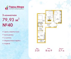 Продается трехкомнатная квартира с предчистовой отделкой в ЖМ "Город Мира" на 8 этаже. Общая площадь: 79.93 кв.м., жилая: 42.86 кв.м., площадь просторной кухни-столовой: 16.07 кв.м. Квартира - распашонка, без проходных комнат, окна выходят на paзные стороны дома. В квартире одна лоджия, один совмещенный и один раздельный санузел. Высота потолков 2.7 м.