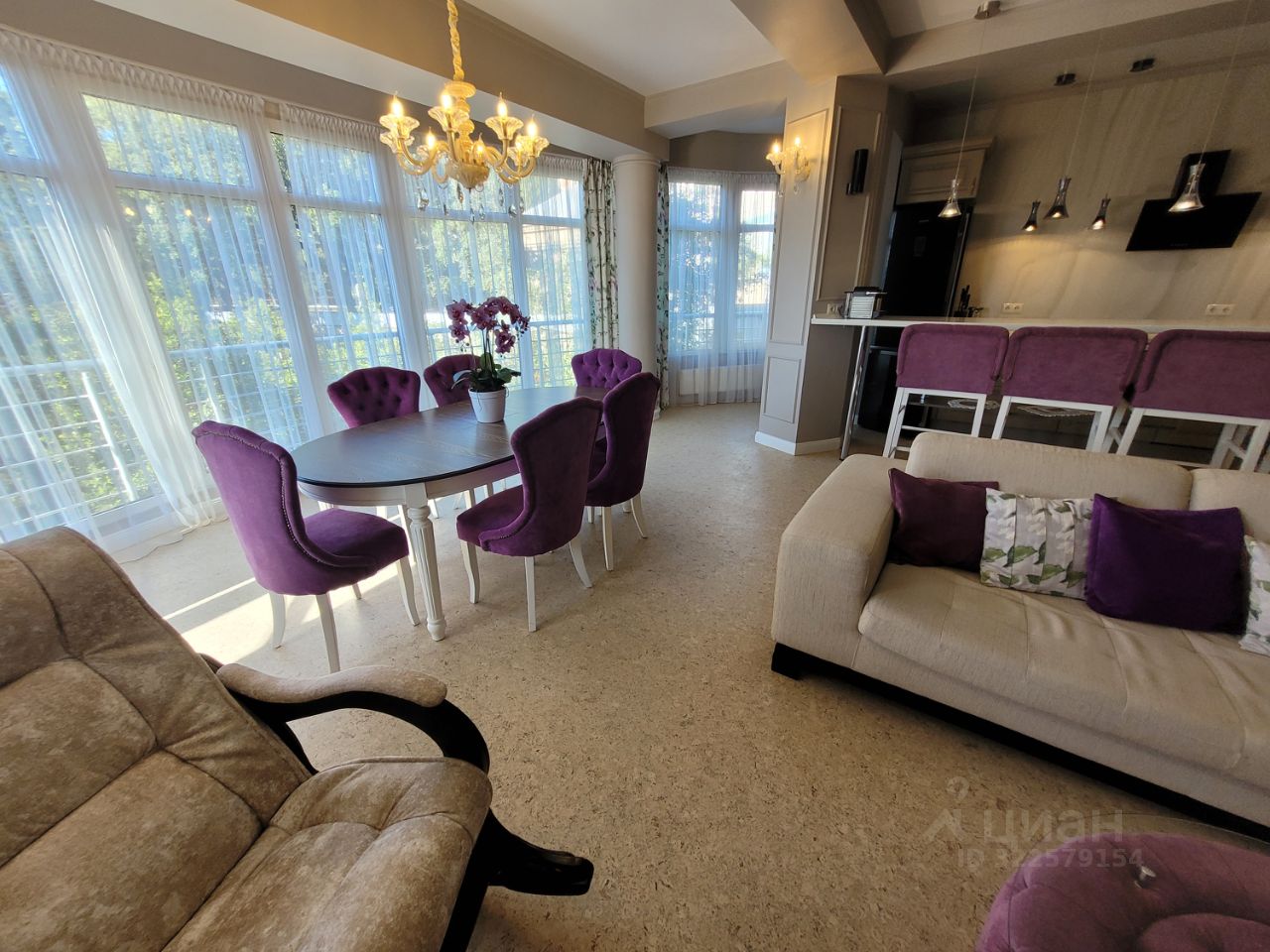 В большой гостиной, совмещённой с кухней, панорамные окна в парк на западную сторону.