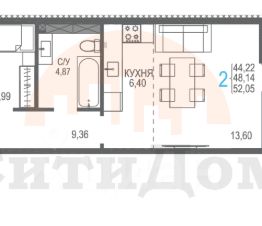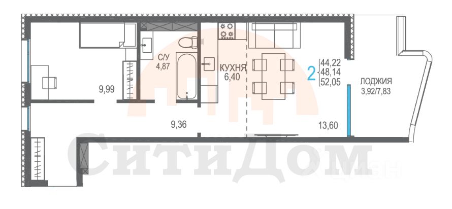 Общая площадь 52 м² на 5 этаже. Кухня 20 кв.м, спальня 10 кв.м, с/у совмещенный, лоджия.