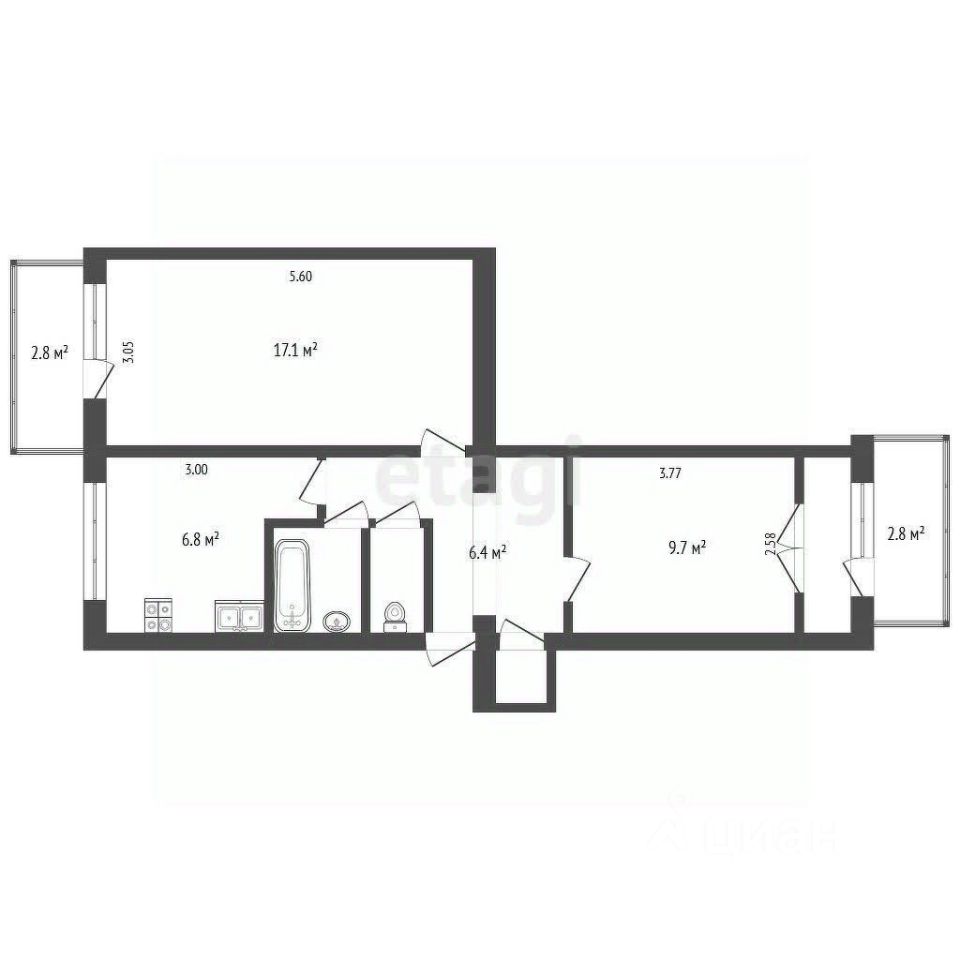 Квартира расположена на 1-м этаже 5-ти этажного дома ( высокий 1-ый этаж). 2 раздельные жилые комнаты 17.1 кв.м и 9.7 кв.м, совмещенный санузел, коридор 6.4 кв.м, кухня 6.8 кв.м, лоджия и балкон.