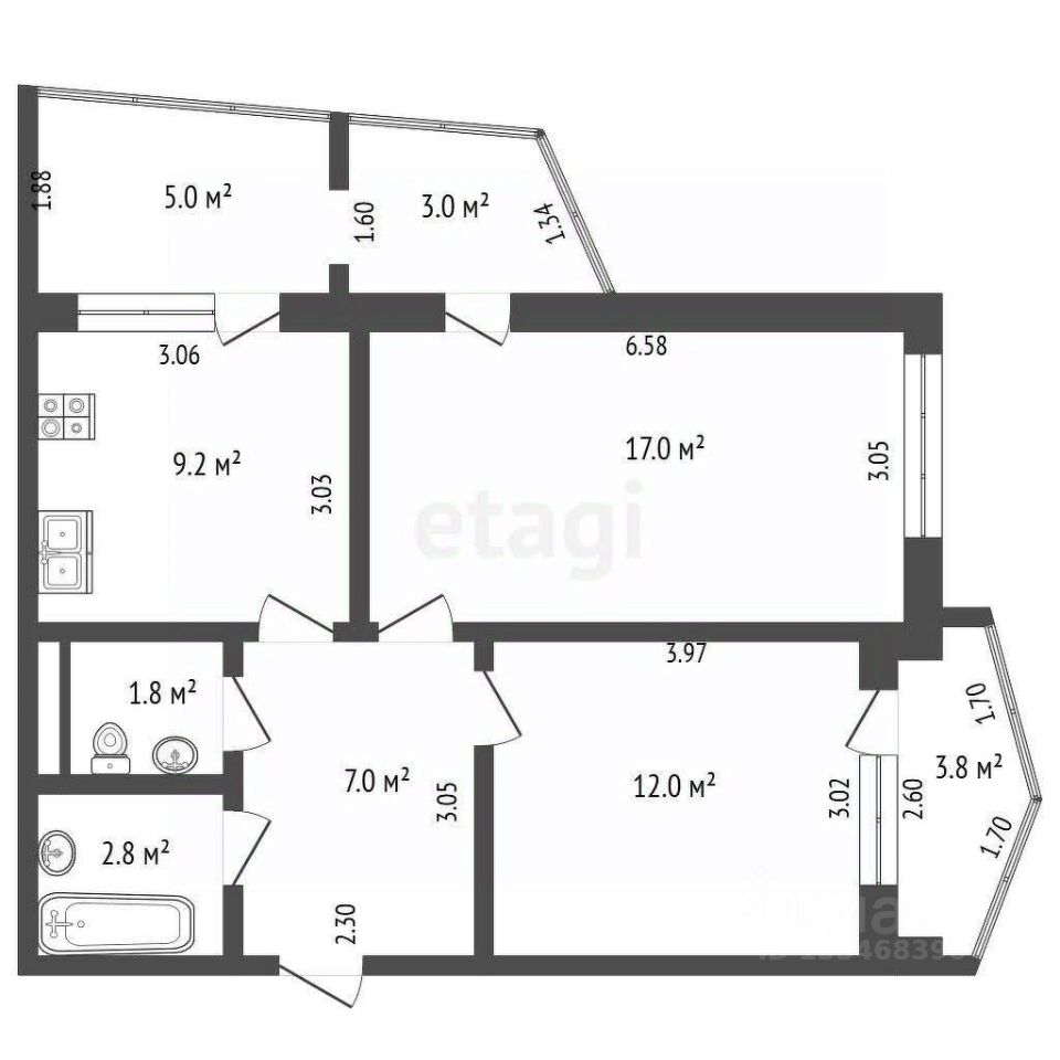Квартира имеет удобную планировку с изолированными комнатами площадью 17 м2 и 12 м2, обеспечивающими каждому члену семьи личное пространство.