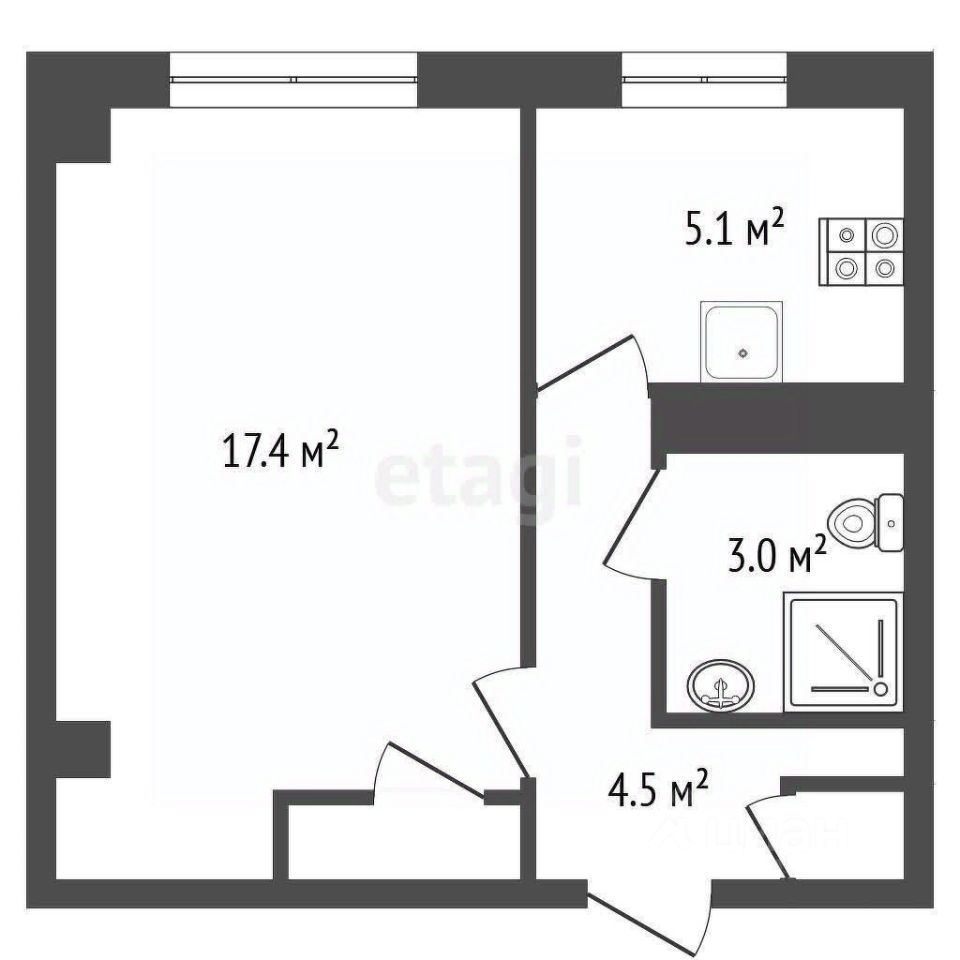 Планировка: прихожая 4,5 м2 с возможностью организовать гардеробную, коридор 3,65 м2, совмещенный санузел 3 м2, кухня 5,1 м2, просторная гостиная 17,4 м2 .