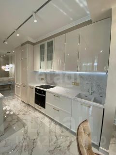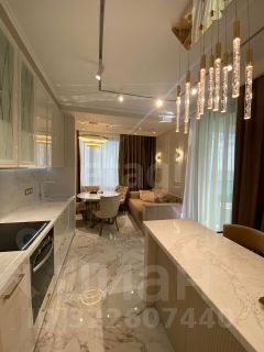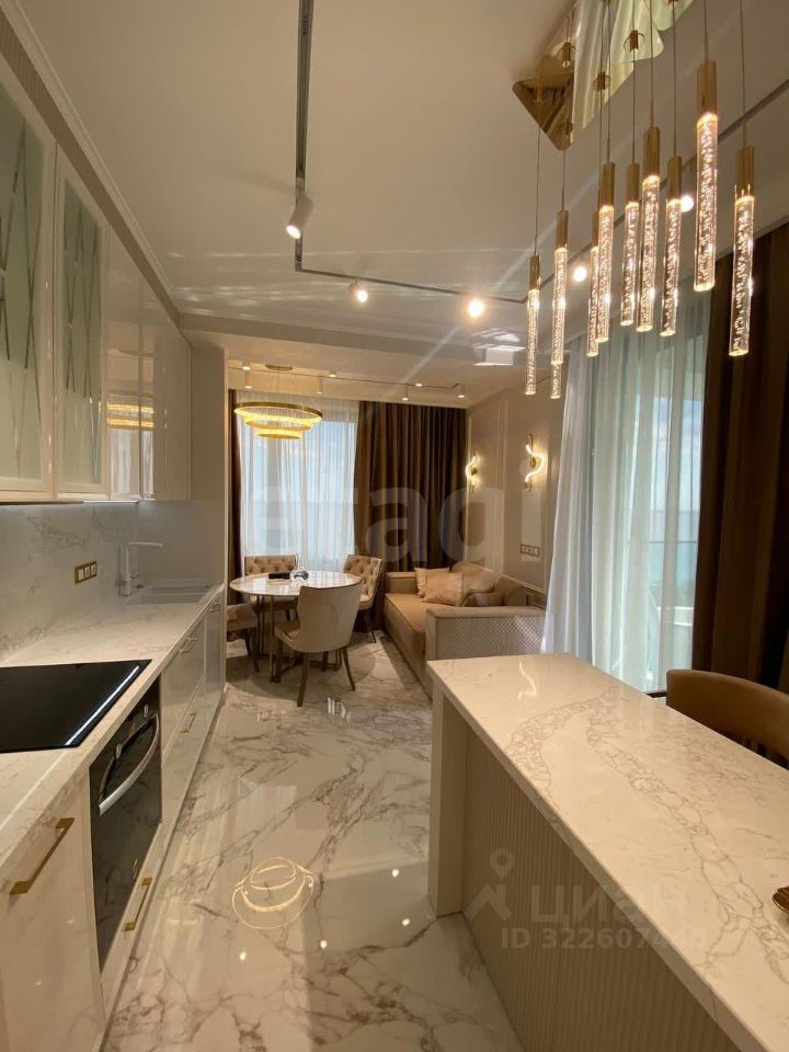 Апартаменты имеют редкую торцевую планировку с панорамным видом на море. Пространство включает прихожую, совмещенную кухню-гостиную, спальню с гардеробной и выходом на террасу, а также санузел с душевой кабиной. Отделка выполнена в стиле ар-деко с использованием премиальных материалов от итальянских, испанских и немецких производителей. Встроенная кухонная техника Neff, мебель по индивидуальному дизайн-проекту и система водяного подогрева полов Rehau обеспечивают высокий уровень комфорта.