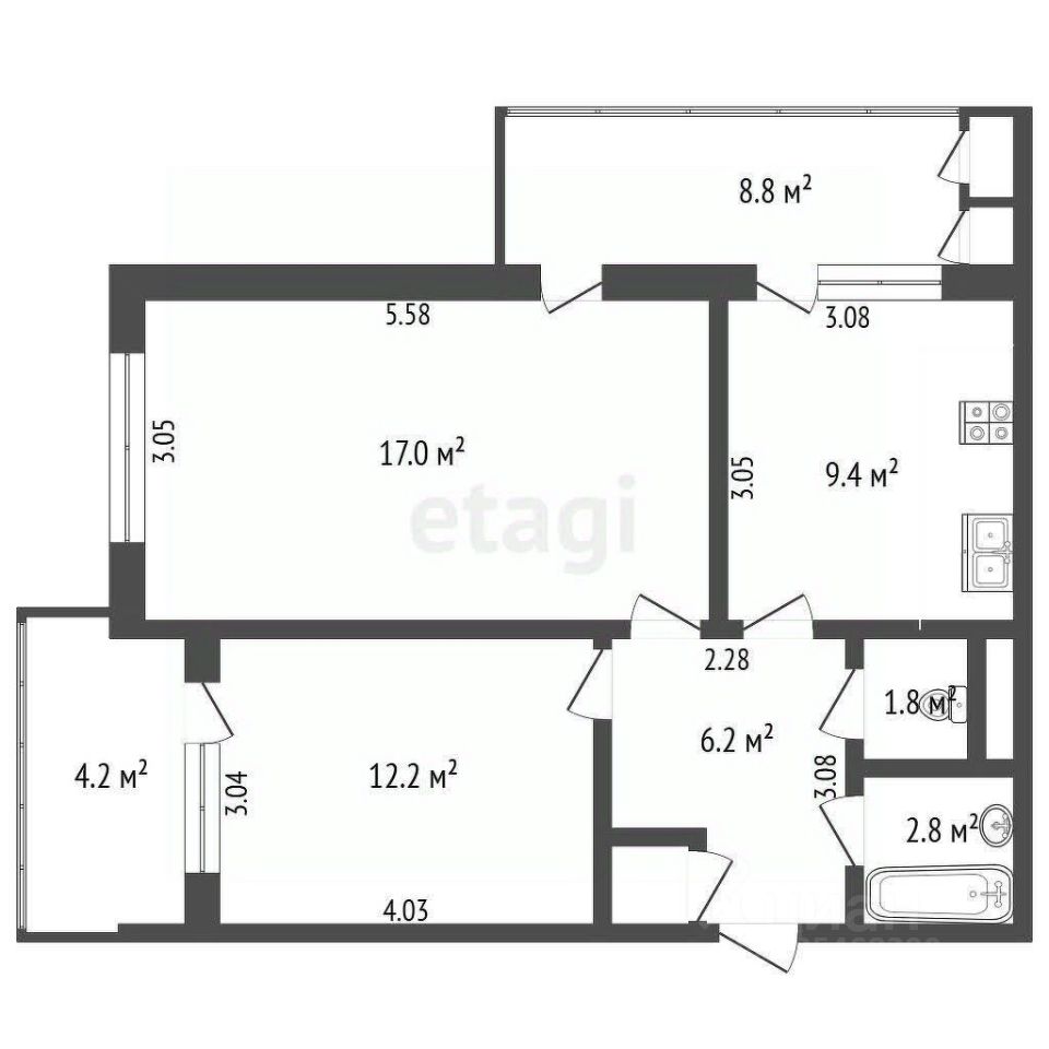 Квартира общей площадью 62.8 кв.м. состоит из двух изолированных комнат, кухни, видового балкон-4.2 кв.м. и лоджии 8.8 кв.м, раздельного санузла и функционального коридора. Большие окна и открытые пространства создают ощущение простора, а выход на балкон и лоджию позволяет в полной мере насладиться живописными видами. В квартире проведено центральное отопление, установлена электроплита и бойлер для бесперебойного горячего водоснабжения.