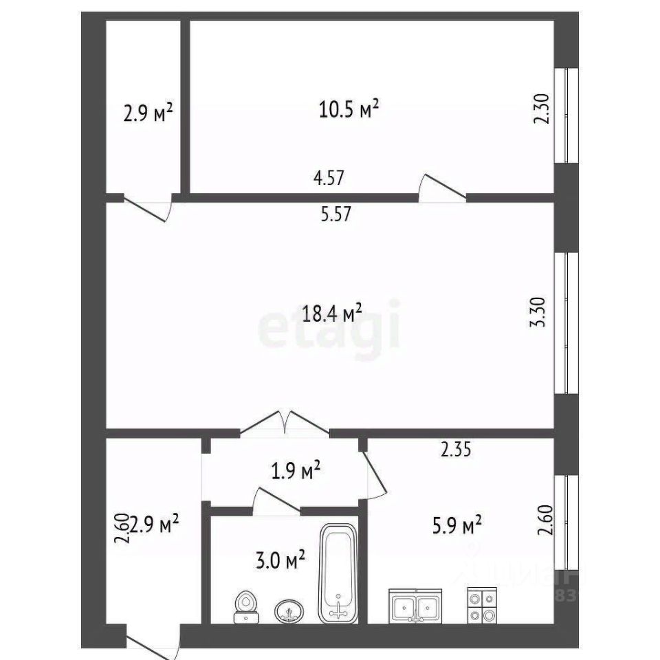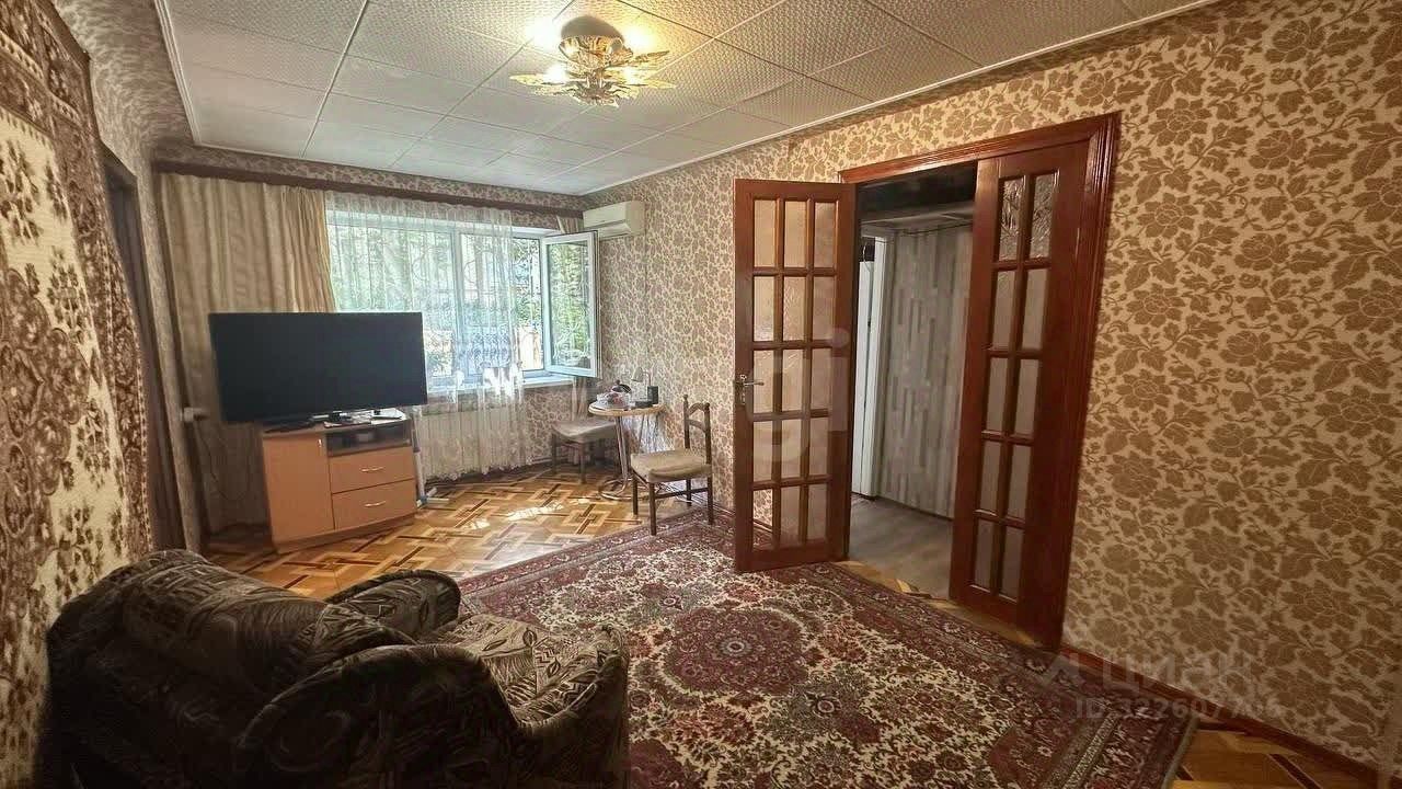 Квартира расположена на 1- ом этаже 5-ти этажного дома, окна выходят в палисадник. Чистый, ухоженный дом и подъезд. Общая площадь квартиры 44.7 кв.м., две комнаты ( смежные) 18.4 кв.м и 10.5 кв.м, кухня 5.9 кв.м, смежный санузел.