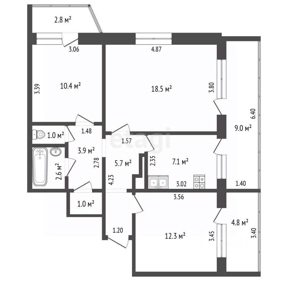 Общая площадь 70.2 м² включает три изолированные комнаты , кухню 7,1 м², раздельный санузел, а также кладовую 1 м² для хранения.