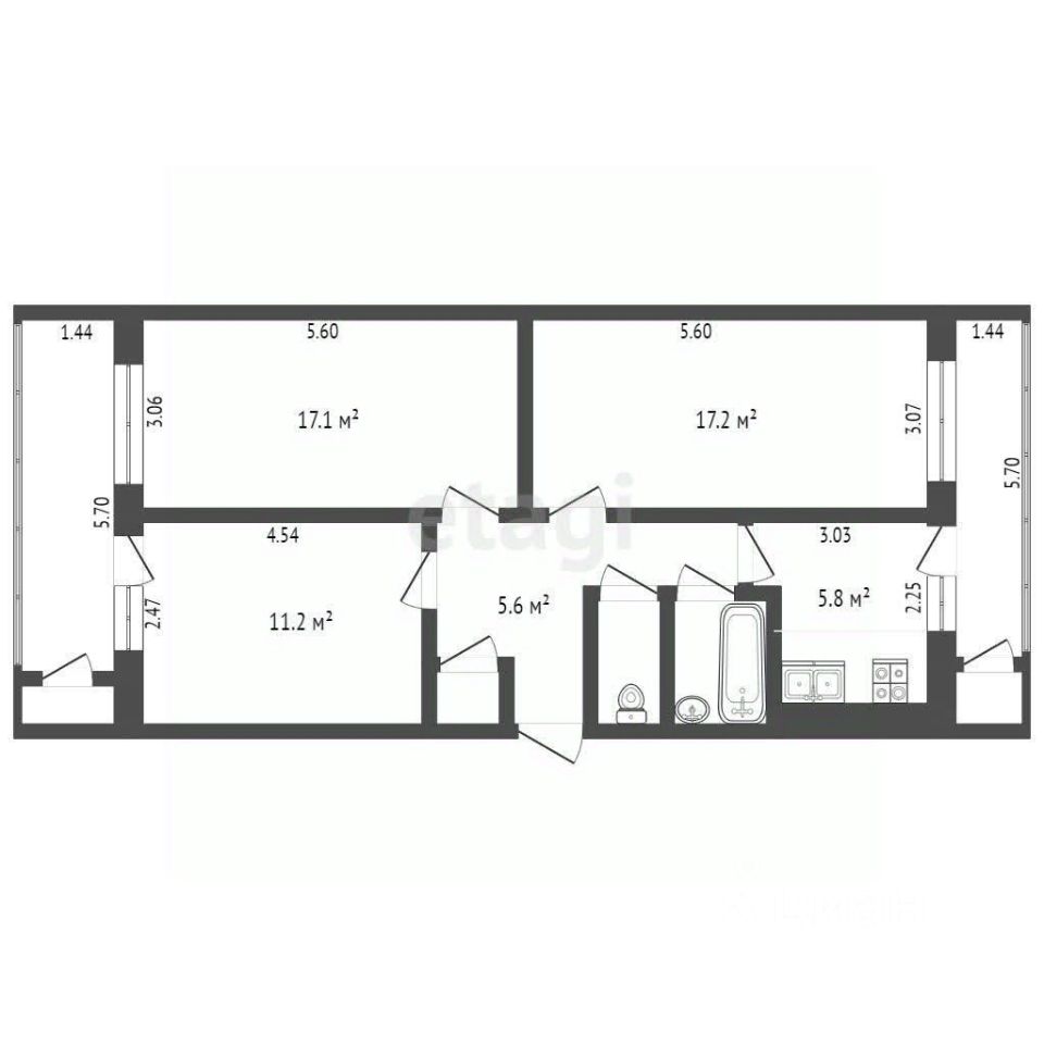 Жилые комнаты 17.2 кв.м, 17.1 кв.м, 11.2 кв.м, кухня 5.8 кв.м, две застекленные