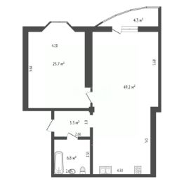 Планировка: прихожая 5,3 м2, совмещенный санузел 5,8 м2, кухня-гостиная 49,2 м2, спальня 25,7 м2.