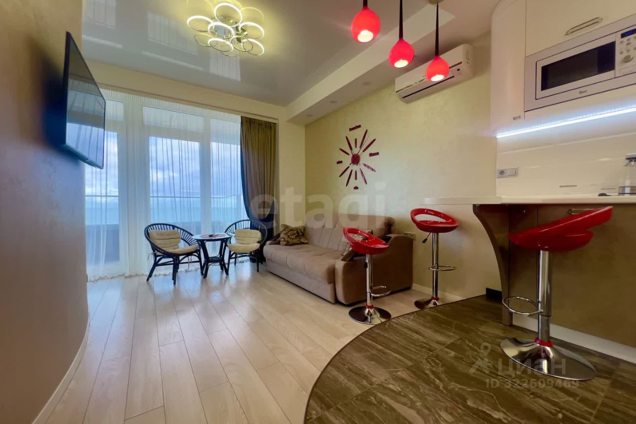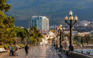 Планировка: прихожая, совмещенный санузел, спальня и кухня-гостиная. Выход на открытую террасу с видом на набережную, морские просторы и побережье Ялты.