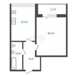 Общая площадь - 47,67 кв.м., необычная планировка, которая включает в себя прихожую, сан.узел, кухню, комнату площадью 16,2 кв.м. и комнату площадью 18,5 кв.м., а также балкон с отличным видом.