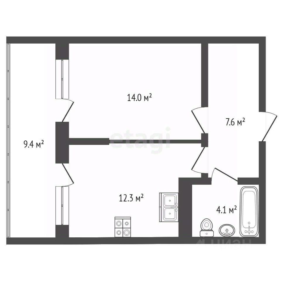 Апартаменты двухкомнатные комнатные, общей площадю 47,4 м2. Планировка представляет собой: кухню-гостиную, изолированную спальню, санузел, отделка white box.