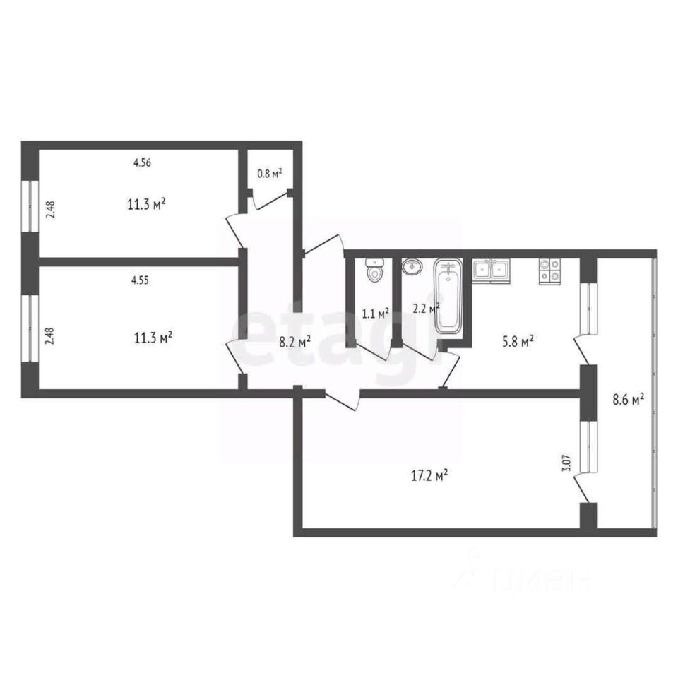 Квартира с новым ремонтом, с двумя спальнями 11.3 м2 и 11.3 м2 и гостиной 17.2 м2.