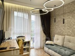 В квартире прихожая, переходящая в кухню, изолированная спальня с видом на горы, комната с видовым балконом на водопад Учан-Су и частично на море.