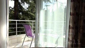 Из панорамных окон апартамента открывается вид на многолетние хвойные деревья.