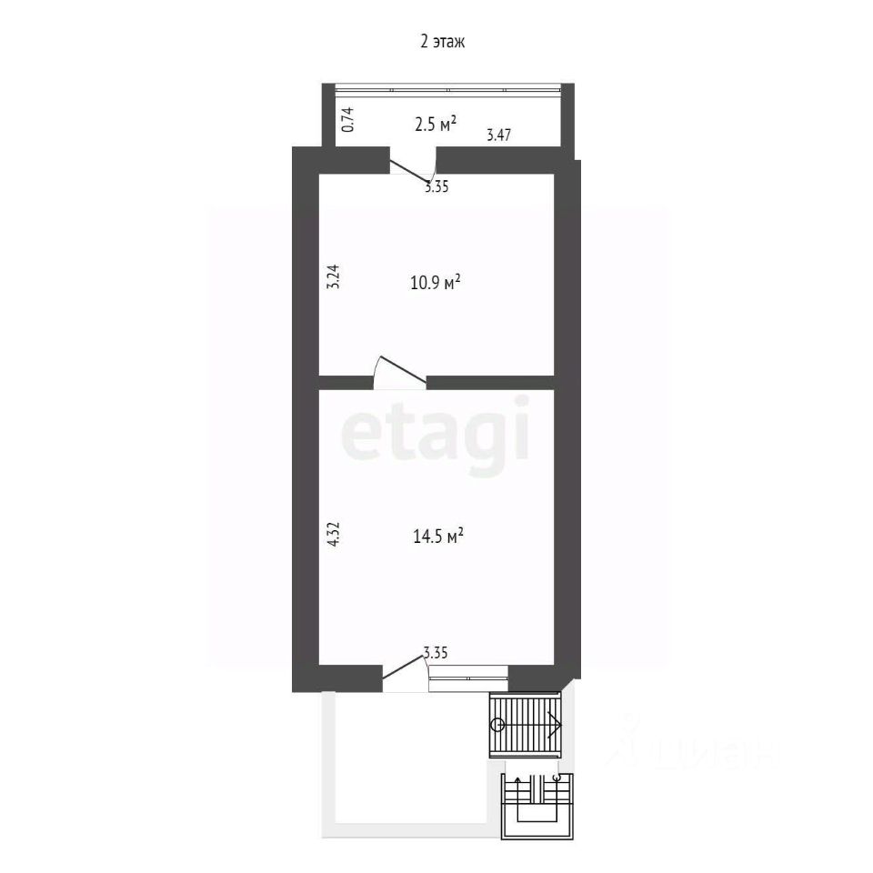 Второй этаж включает в себя кухню-гостинную с совмещенным санузлом 14,5 кв.м., спальню 10,9 кв.м., а так же балкон 2,5 кв.м.