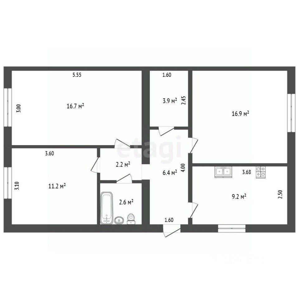Планировка улучшенная: комнаты 11.2; 16.7; 16.9 квадратных метра, четвертая комната (кладовая) 3.9 квадратных метра без окна, 2 прихожие, первая 2.2 квадратных метра, вторая 6.4, это прихожая перед входом в квартиру. Санузел совмещен.