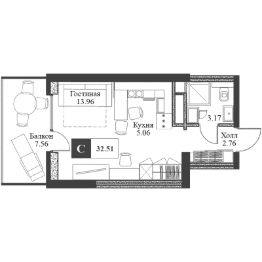 Предлагаем апартаменты студийного формата (32.58 м²) на 3 этаже апарт-комплекса Бизнес-класса Крымская Резиденция во 2 корпусе Пушкин - панорамный вид на горы!
