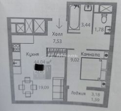 Общая площадь 44 кв. м. (с учетом лоджии), жилая 19 кв. м., кухня 12 кв. м.