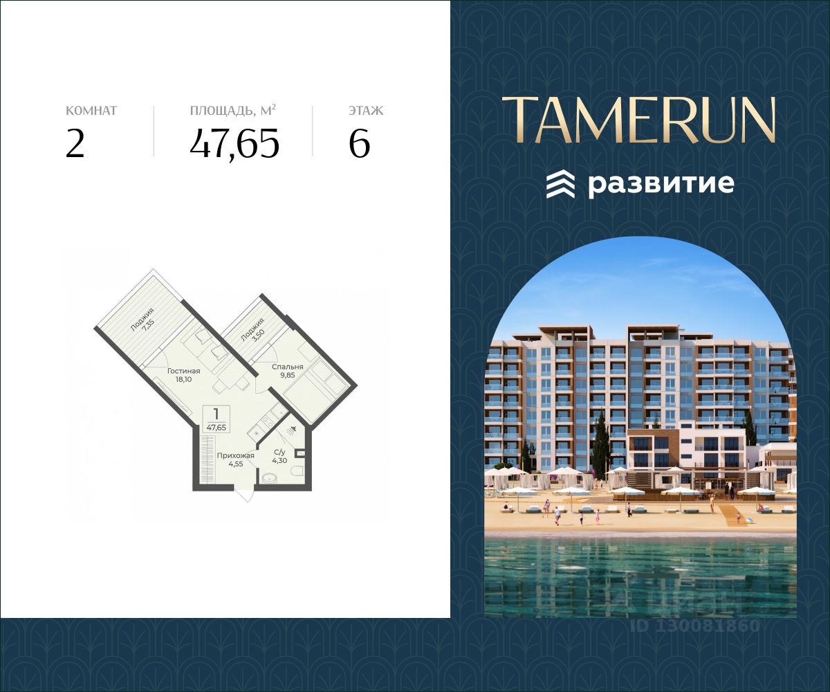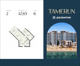 В продаже 2 комнатный апартамент площадью 47.65 кв. м, без отделки. Апартамент расположен в апарт-комплексе Tamerun от ГК "Развитие". Tamerun - морская резиденция на Западном берегу Крыма, между городами Евпатория и Саки. Апарт-комплекс расположен на первой береговой линии в живописной бухте Каламийского залива, между Черным морем и розовым озером Сасык. В рамках реализации проекта предусмотрено 1213 доходных апартаментов с первоклассным отельным и санаторно-курортным сервисом. Клубная инфраструктура, историческая локация, интерьеры от ведущих дизайнеров - все это и многое другое ждет вас в солнечной резиденции Tamerun. Расположение Пешком: - 15 мин. до Ж/Д станции "Техникум"; - 20 мин. до Ж/Д станции "Прибрежная"; - 25 мин. до Пирса у озера Сасык-Сиваш. На автомобиле: - 5 мин. до Симферопольского шоссе; - 10 мин. до города Саки; - 20 мин. до Евпатории; - 45 мин. до аэропорта имени И. К. Айвазовского. Благоустройство - собственный клубный пляж; - развлекательный центр; - 2 открытых и 1 закрытый бассейн; - медицинский SPA-комплекс; - фитнес-центр с залами для йоги и гимнастики; - площадки для тенниса, футбола и волейбола; - амфитеатр на свежем морском воздухе; - лаунж-зона и прогулочные дорожки; - детский клуб с кинотеатром; - батуты, лабиринты и скалодромы для подростков; - конференц-зал на 50 человек и переговорные кабинеты; - более 100 растений в приватном дворе; - круглосуточный консьерж-сервис; - подземный паркинг на 188 машино-мест с автомойкой; - наземная гостевая парковка на 259 машино-мест; - летнее кафе, 3 ресторана и супермаркет прямо в доме. Окружение - Сасыкский заказник, крупнейшее в Крыму соленое розовое озеро Сасык-Сиваш, песчаные пляжи протяженностью в 150 метров; - главная мечеть Евпатории Джума-Джами, Собор Николая Чудотворца, Комплекс Караимских кенас; - множество другой повседневной инфраструктуры в ближайшем городе Саки.