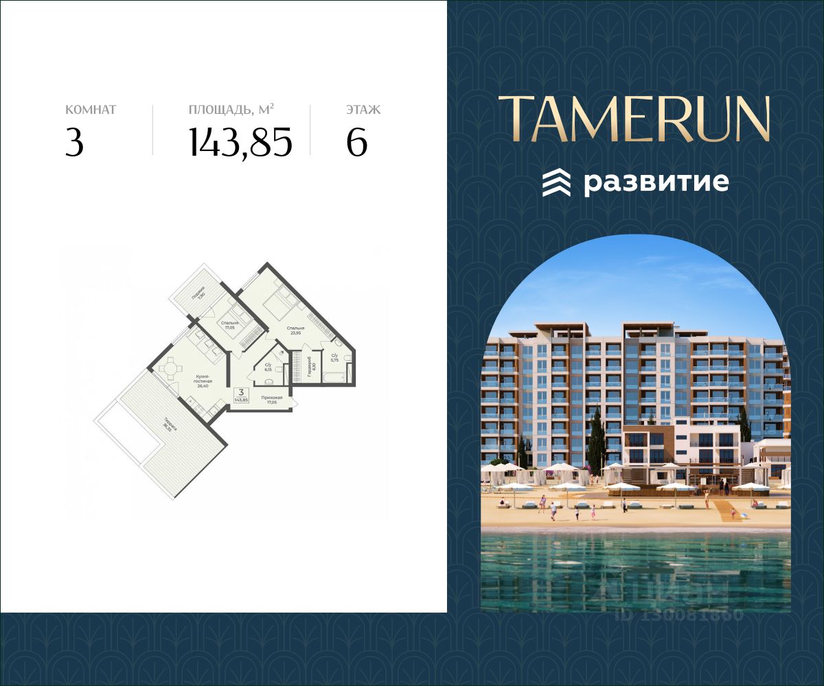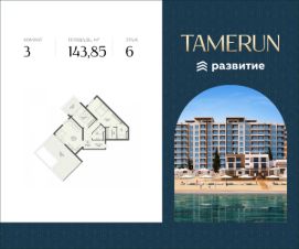 В продаже 3 комнатный апартамент площадью 143.85 кв. м, без отделки. Апартамент расположен в апарт-комплексе Tamerun от ГК "Развитие".