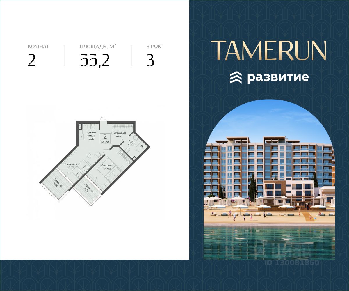 На первой береговой линии Черного моря продается апартамент площадью 55.20 кв. м без отделки. Апартамент находится в апарт-комплексе премиум-класса Tamerun Grand Mirmax 5*, между городами Евпатория и Саки от федерального застройщика ГК "Развитие".