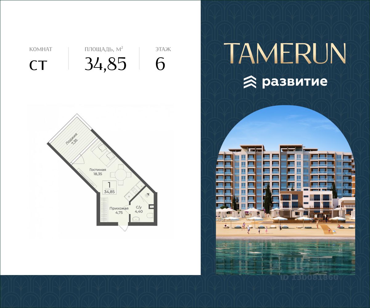 На первой береговой линии Черного моря продается апартамент площадью 34.85 кв. м без отделки. Апартамент находится в апарт-комплексе премиум-класса Tamerun Grand Mirmax 5*, между городами Евпатория и Саки от федерального застройщика ГК "Развитие".