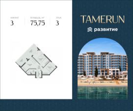 В продаже 3 комнатный апартамент площадью 75.75 кв. м, без отделки. Апартамент расположен в апарт-комплексе Tamerun от ГК "Развитие".