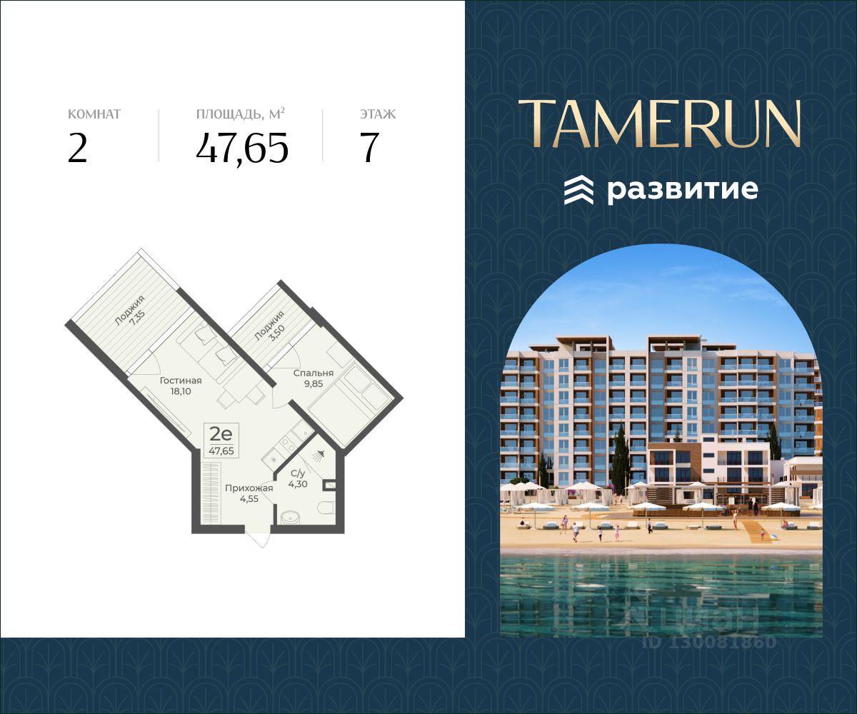 В продаже 2 комнатный апартамент площадью 47.65 кв. м, без отделки. Апартамент расположен в апарт-комплексе Tamerun от ГК "Развитие". Tamerun - морская резиденция на Западном берегу Крыма, между городами Евпатория и Саки. Апарт-комплекс расположен на первой береговой линии в живописной бухте Каламийского залива, между Черным морем и розовым озером Сасык. В рамках реализации проекта предусмотрено 1213 доходных апартаментов с первоклассным отельным и санаторно-курортным сервисом. Клубная инфраструктура, историческая локация, интерьеры от ведущих дизайнеров - все это и многое другое ждет вас в солнечной резиденции Tamerun. Расположение Пешком: - 15 мин. до Ж/Д станции "Техникум"; - 20 мин. до Ж/Д станции "Прибрежная"; - 25 мин. до Пирса у озера Сасык-Сиваш. На автомобиле: - 5 мин. до Симферопольского шоссе; - 10 мин. до города Саки; - 20 мин. до Евпатории; - 45 мин. до аэропорта имени И. К. Айвазовского. Благоустройство - собственный клубный пляж; - развлекательный центр; - 2 открытых и 1 закрытый бассейн; - медицинский SPA-комплекс; - фитнес-центр с залами для йоги и гимнастики; - площадки для тенниса, футбола и волейбола; - амфитеатр на свежем морском воздухе; - лаунж-зона и прогулочные дорожки; - детский клуб с кинотеатром; - батуты, лабиринты и скалодромы для подростков; - конференц-зал на 50 человек и переговорные кабинеты; - более 100 растений в приватном дворе; - круглосуточный консьерж-сервис; - подземный паркинг на 188 машино-мест с автомойкой; - наземная гостевая парковка на 259 машино-мест; - летнее кафе, 3 ресторана и супермаркет прямо в доме. Окружение - Сасыкский заказник, крупнейшее в Крыму соленое розовое озеро Сасык-Сиваш, песчаные пляжи протяженностью в 150 метров; - главная мечеть Евпатории Джума-Джами, Собор Николая Чудотворца, Комплекс Караимских кенас; - множество другой повседневной инфраструктуры в ближайшем городе Саки.