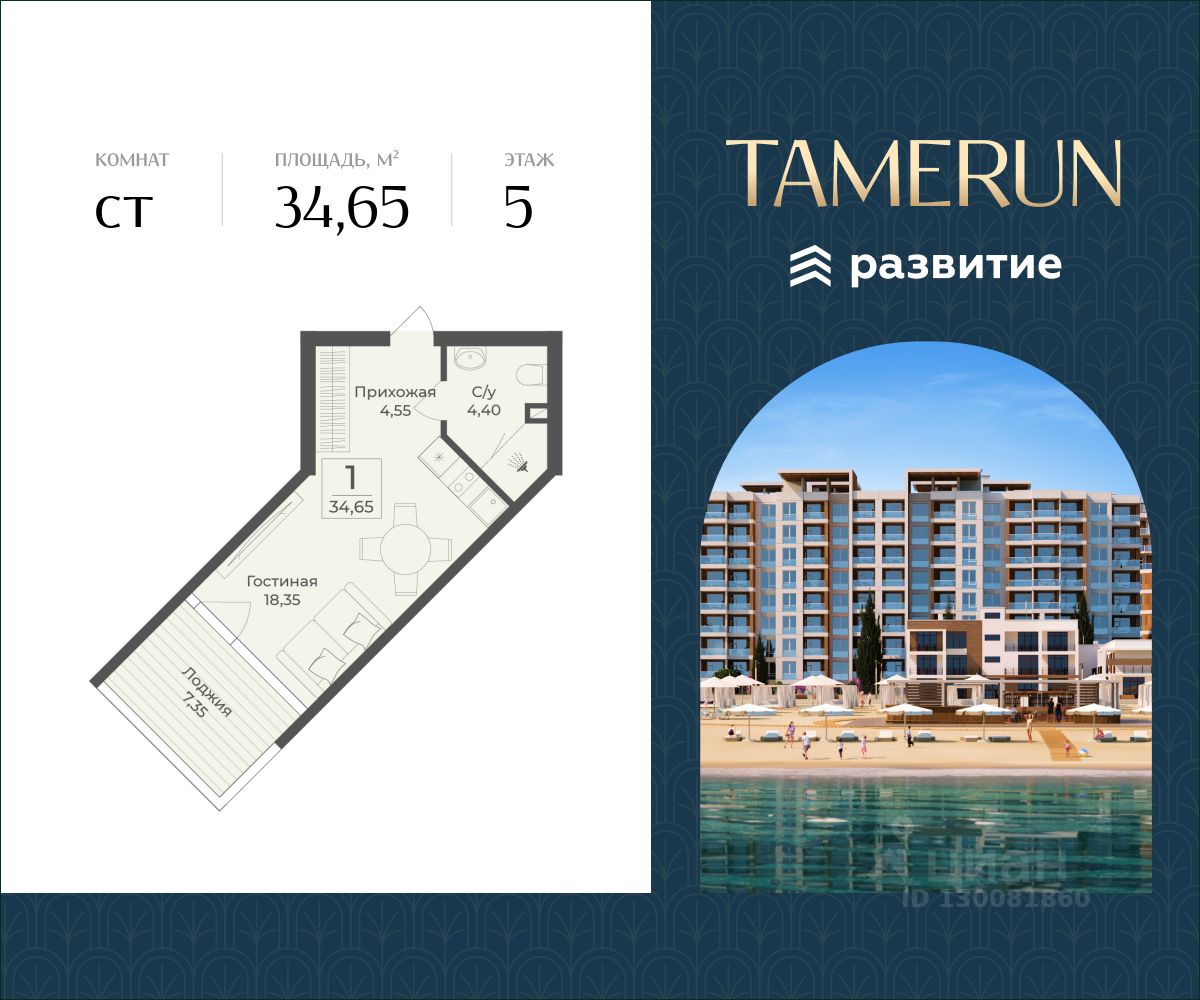 На первой береговой линии Черного моря продается апартамент площадью 34.65 кв. м без отделки. Апартамент находится в апарт-комплексе премиум-класса Tamerun Grand Mirmax 5*, между городами Евпатория и Саки от федерального застройщика ГК "Развитие". Tamerun - дом у моря для тех, кто мечтает о тишине, окружении парков и воды. На приватной территории с собственным пляжем расположены видовые апартаменты, бассейны, спа, рестораны и эстетичные сады. Персонализированный сервис здесь исполняет пожелания, создавая атмосферу пятизвездочного отеля у вас дома. Резиденция сочетает преимущества мягкого климата, близость к городам Саки и Евпатория и доступ к целебным источникам. Это пространство вдали от туристического шума идеально для круглогодичного комфортного проживания и здорового образа жизни. Расположение Пешком: - 3 минуты до приватного пляжа у Черного моря; - 15 минут до Ж/Д станции "Техникум"; - 25 минут до пирса у озера Сасык-Сиваш; На автомобиле: - 5 мин. до Симферопольского шоссе; - 10 мин. до города Саки; - 20 мин. до Евпатории; - 45 мин. до аэропорта имени И. К. Айвазовского; - 60 мин. до Ж/Д вокзала Симферополя. Инфраструктура для детей и взрослых - Эксклюзивный клубный пляж; - Виндсерфинг, дайвинг, катание на лодках и другие виды водного спорта; - Спортивный корт для тенниса, футбола и волейбола; - Приватная парковая территория; - Оздоровительный спа-комплекс; - 2 открытых и 1 закрытый бассейны с морской водой; - Банный комплекс с купелями, хамамом, снежной и соляной комнатами; - Развлекательный центр; - Детский клуб с кинотеатром; - Батуты, лабиринты и скалодромы для подростков; - Конференц-зал на 50 человек и переговорные кабинеты; - Бильярдный клуб; - Фитнес-центр с новейшими тренажерами; - Торговая галерея прямо в доме; - Летнее кафе, 3 ресторана и супермаркет; - Гранд-лобби в главном корпусе; - Просторные входные группы с колясочными и велосипедными; - Подземный паркинг на 188 машино-мест с автомойкой; - Наземная гостевая парковка на 259 машино-мест; - Видеонаблюдение, охрана, вход только по пропускам. Живописный ландшафт - Всесезонный сад: зеленый и цветущий двор круглый год; - Более 100 растений в приватном саду; - Амфитеатр на свежем морском воздухе; - Лаунж-зоны и прогулочные дорожки; - Крупнейшее в Крыму соленое розовое озеро Сасык-Сиваш и Сасыкский заказник; - Песчаные пляжи протяженностью 150 метров; - Главная мечеть Евпатории Джума-Джами, Собор Николая Чудотворца, Комплекс Караимских кенас в непосредственной близости. Проект для инвестиций - Федеральный девелопер, входящий в ТОП-20 застройщиков России; - Профессиональный отельный оператор; - Консьерж-сервис 24/7: бронирование, аренда, клининг, доставка; - Для инвесторов - полное делегирование обслуживания апартаментов; - Пассивный доход от 1,5 млн руб. в год; - Потенциал роста стоимости - 35% в год; - Срок окупаемости при сдаче в аренду - 5-6 лет; - Востребованность весь год (на 70% в среднем заселен комплекс).