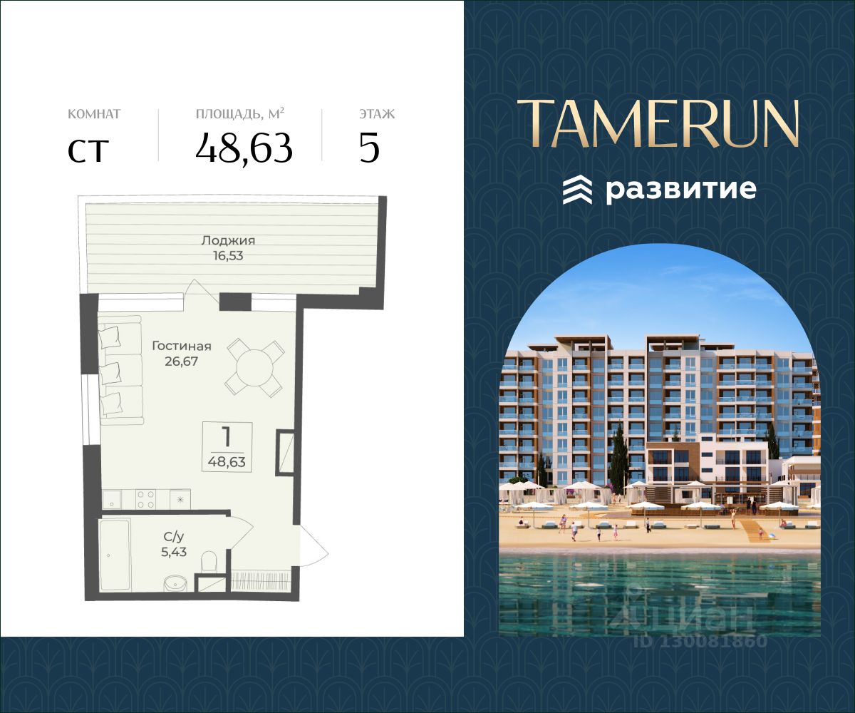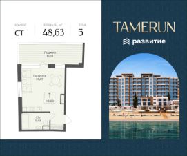 В продаже s комнатный апартамент площадью 48.63 кв. м, без отделки. Апартамент расположен в апарт-комплексе Tamerun от ГК "Развитие".