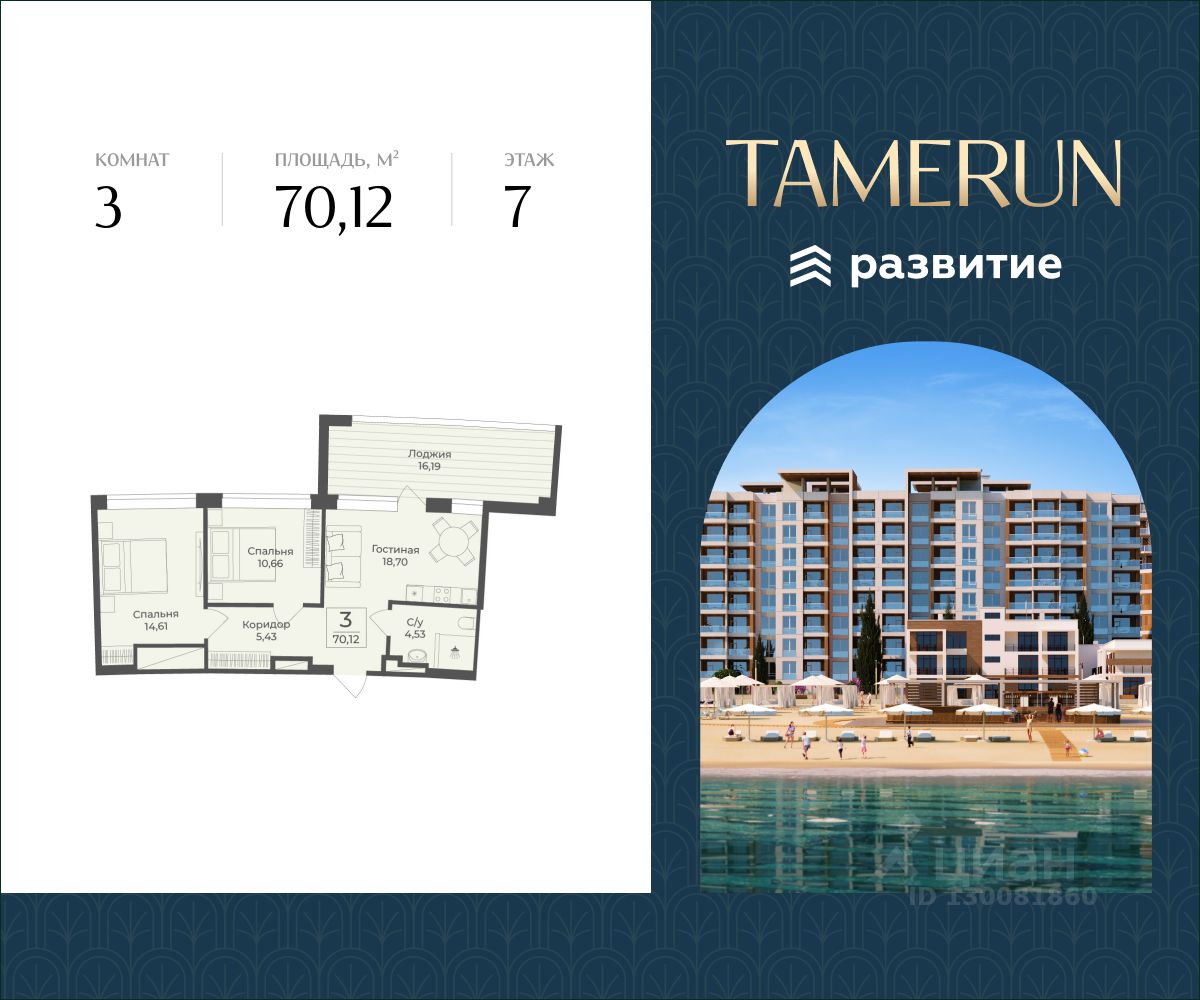 В продаже 3 комнатный апартамент площадью 70.12 кв. м, без отделки. Апартамент расположен в апарт-комплексе Tamerun от ГК "Развитие".