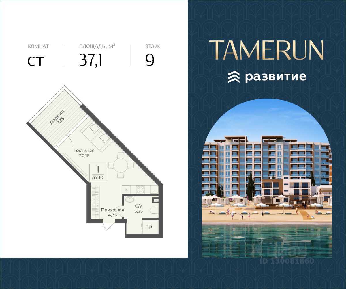В продаже s комнатный апартамент площадью 37.10 кв. м, без отделки. Апартамент расположен в апарт-комплексе Tamerun от ГК "Развитие".