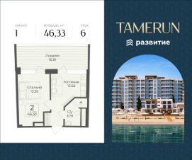 В продаже 1 комнатный апартамент площадью 46.33 кв. м, без отделки. Апартамент расположен в апарт-комплексе Tamerun от ГК "Развитие".