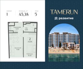 В продаже 1 комнатный апартамент площадью 45.38 кв. м, без отделки. Апартамент расположен в апарт-комплексе Tamerun от ГК "Развитие".
