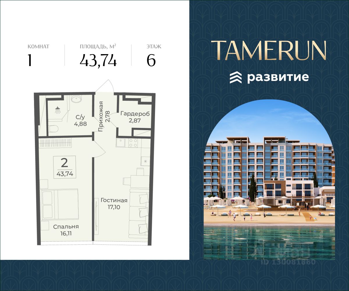 В продаже 1 комнатный апартамент площадью 43.74 кв. м, без отделки. Апартамент расположен в апарт-комплексе Tamerun от ГК "Развитие".