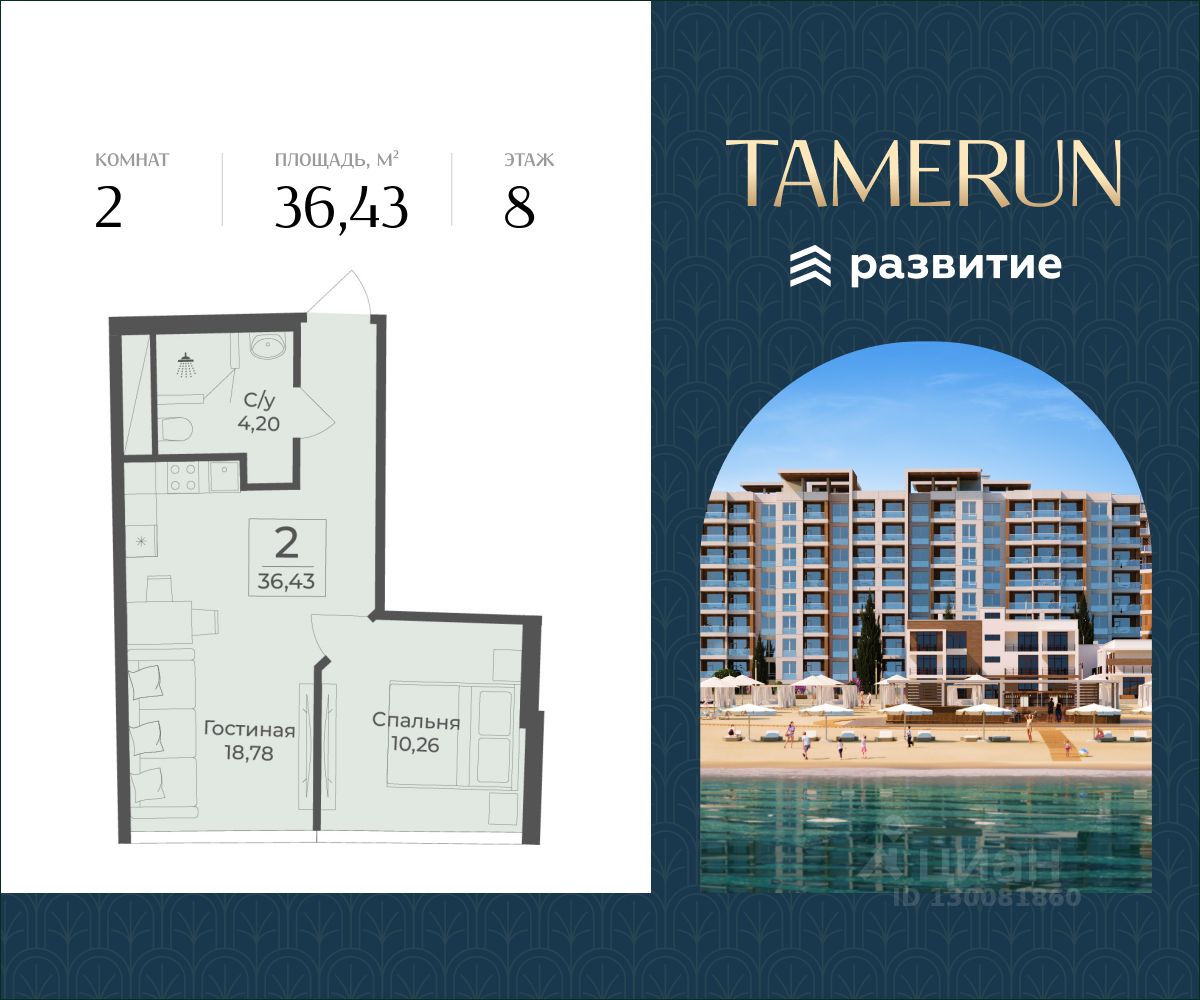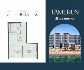В продаже 2 комнатный апартамент площадью 36.43 кв. м, без отделки. Апартамент расположен в апарт-комплексе Tamerun от ГК "Развитие".