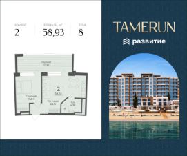 В продаже 2 комнатный апартамент площадью 58.93 кв. м, без отделки. Апартамент расположен в апарт-комплексе Tamerun от ГК "Развитие".