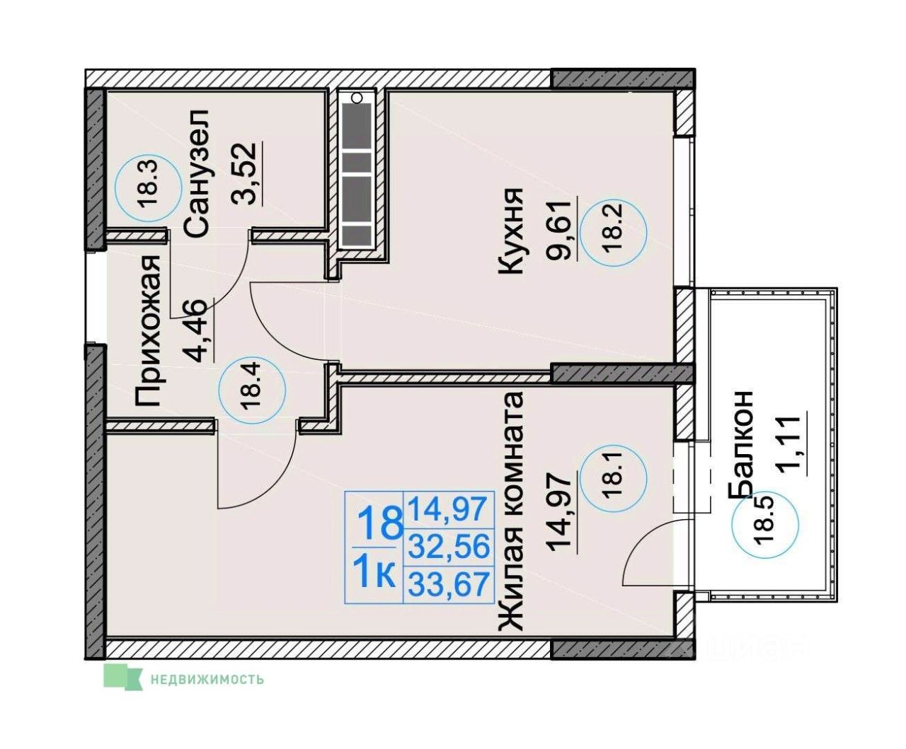 Общая площадь33,67 м²