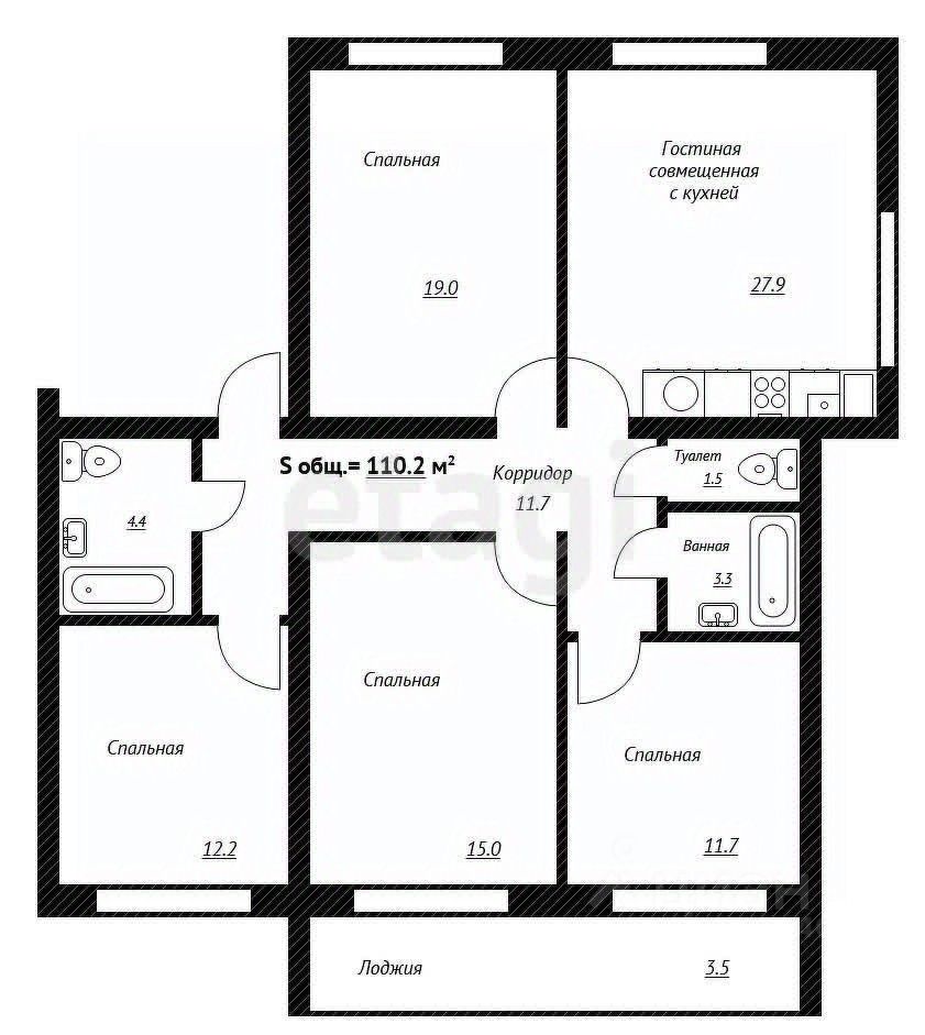 Квартира состоит из 3х жилых комнат, одной кухни, двух санузлов: один совмещенный на 1 этаже площадью 4,3 кв.м. и туалета площадью 0,9 кв.м. на 2 этаже.