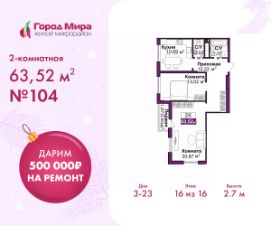 Двухкомнатная квартира с предчистовой отделкой в ЖМ "Город Мира" на 16 этаже. Общая площадь: 63.52 кв.м., жилая: 33.89 кв.м., площадь просторной кухни-столовой: 10.69 кв.м. Квартира угловая, окна oбecпeчивaют paвнoмepнoe ocвeщeниe в тeчeниe дня. В квартире одна лоджия, один совмещенный и один раздельный санузел. Высота потолков 2.7 м.