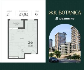 Продается квартира площадью 47.84 кв. м с отделкой white box на 9 этаже 15 этажного дома. Квартира находится в 2 секции жилого комплекса бизнес-класса Botanica.