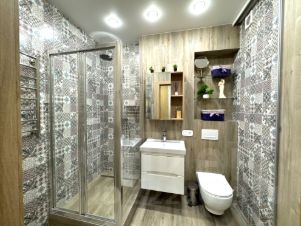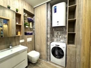 В кухонной зоне установлено дополнительное освещение. В ванной установлена стиральная машина, душевая кабина, зеркало.