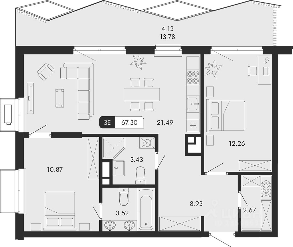 Продаётся 3-комнатная квартира в строящемся доме (дом 2), срок сдачи: III-кв. 2027, общей площадью 67.3 кв.м., на 3 этаже.
