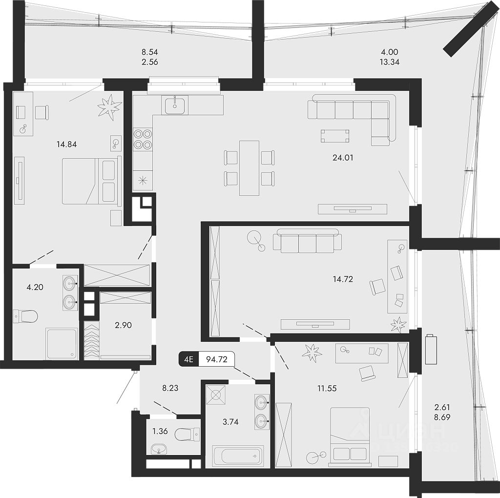 Продаётся 4-комнатная квартира в строящемся доме (дом 2), срок сдачи: III-кв. 2027, общей площадью 94.72 кв.м., на 3 этаже.
