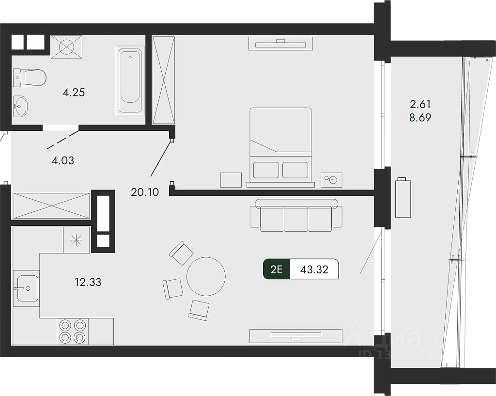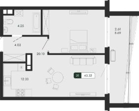 Продаётся 2-комнатная квартира в строящемся доме (дом 2), срок сдачи: III-кв. 2027, общей площадью 43.32 кв.м., на 2 этаже.